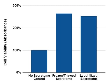 Lyophilization is essential for the long-term storage of the secretome, as it preserves stability at ambient temperatures, eliminates the need for cold-chain logistics and significantly extends shelf life (months, compared to weeks for liquid formulations). Relative to the control treatment of human dermal fibroblasts with secretome-free medium, the frozen/thawed IntercepAge MSC secretome increased the cell viability by approximately 2.5-fold. Post-lyophilization evaluation further demonstrated that the secretome retained its biological activity, as indicated by fibroblast viability comparable to that observed with the frozen/thawed control.