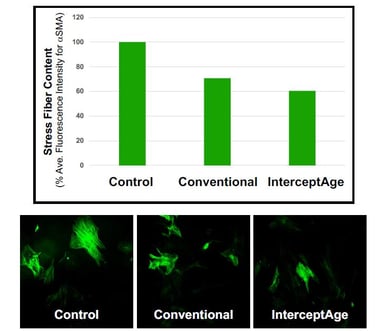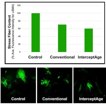 To investigate the capacity of InterceptAge secretome to modulate stress fiber formation, we induced stress fibers in primary human dermal fibroblasts and subsequently treated these cells with either InterceptAge secretome or conventional MSC secretome. Immunofluorescence staining for alpha-smooth muscle actin (α-SMA) was performed to visualize stress fiber formation. Our analysis revealed that InterceptAge secretome significantly outperformed conventional MSC secretome in reducing stress fiber content in human dermal fibroblasts. These findings suggest that InterceptAge secretome may help restore balanced fibroblast function, thereby facilitating cellular rejuvenation.