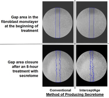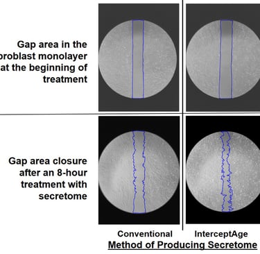 The cell migration assay is an in vitro method used to study the wound-healing process. It enables quantification of cell movements in response to treatment with biologically active compounds, providing insight into their potential efficacy in vivo. Our data demonstrate that the secretome collected from MSCs cultured using InterceptAge’s proprietary method is 2.6-fold more effective in promoting the migration of human skin fibroblasts in vitro compared to that obtained using the conventional method.