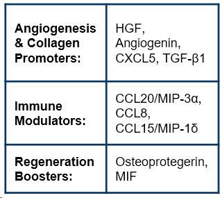 Human mesenchymal stem cells (MSCs) cultured in vitro secrete a complex mixture of bioactive molecules, including soluble factors (e.g., growth factors and cytokines) and extracellular vesicles, collectively referred to as the secretome. Discovery of the secretome’s regenerative and immunomodulatory properties has led to further investigation into its potential use in cell-free therapeutic approaches. Our proprietary MSC secretome significantly upregulated nine key cytokines, which enhance tissue regeneration via angiogenesis and collagen production, while eliminating inflammatory CXCL7/NAP-2 for safer outcomes.